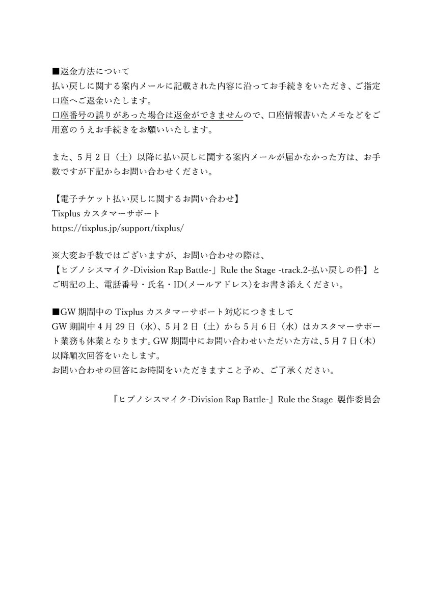 『ヒプノシスマイク-Division Rap Battle-』Rule the Stage -track.2- チケット代金の払い戻し方法に関するお知らせ