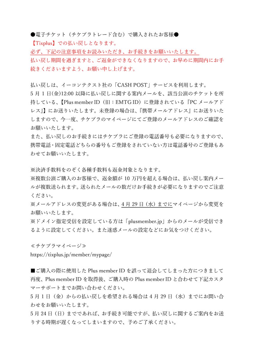 ●電子チケット(チケプラトレード含む)で購入されたお客様●【Tixplus】での払い戻しとなります。必ず、下記の注意事項をお読みいただき、お手続きをお願いいたします。払い戻し期間を過ぎますと、ご返金ができなくなりますので、お早めに期間内にお手続きくださいますよう、お願い申し上げます。払い戻しは、イーコンテクスト社の「CASH POST」サービスを利用します。5月1日(金)12:00以降に払い戻しに関する案内メールを、該当公演のチケットを所持している、【Plus member ID(旧:EMTG ID)に登録されている『PCメールアドレス』】にお送りいたします。未登録の場合は、『携帯メールアドレス』にお送りいたしますので、今一度、チケプラのマイページにてご登録のメールアドレスのご確認をお願いいたします。また、払い戻しのお手続きにはチケプラにご登録の電話番号も必要になりますので、携帯電話・固定電話どちらの番号もご登録をされていない方は電話番号のご登録もあわせてお願いいたします。