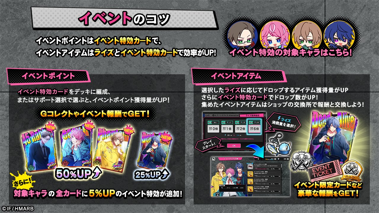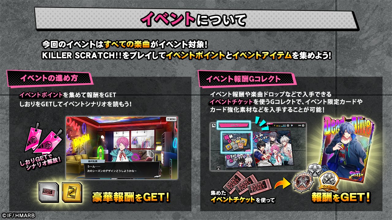 専用アイテムは対象曲プレイでゲット、さらにイベントptも貰えそれが溜まると報酬が貰えたりストーリーが解禁されたりする