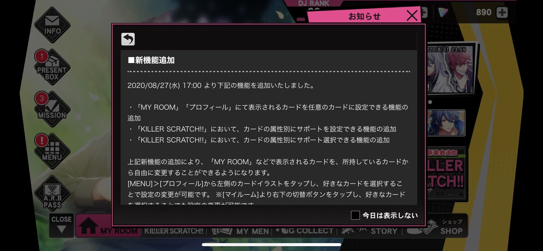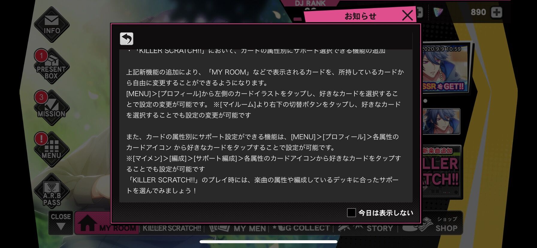 MENU→プロフィールからMY ROOMなどで表示されるカードをリーダーと関係なく選べるように変更
