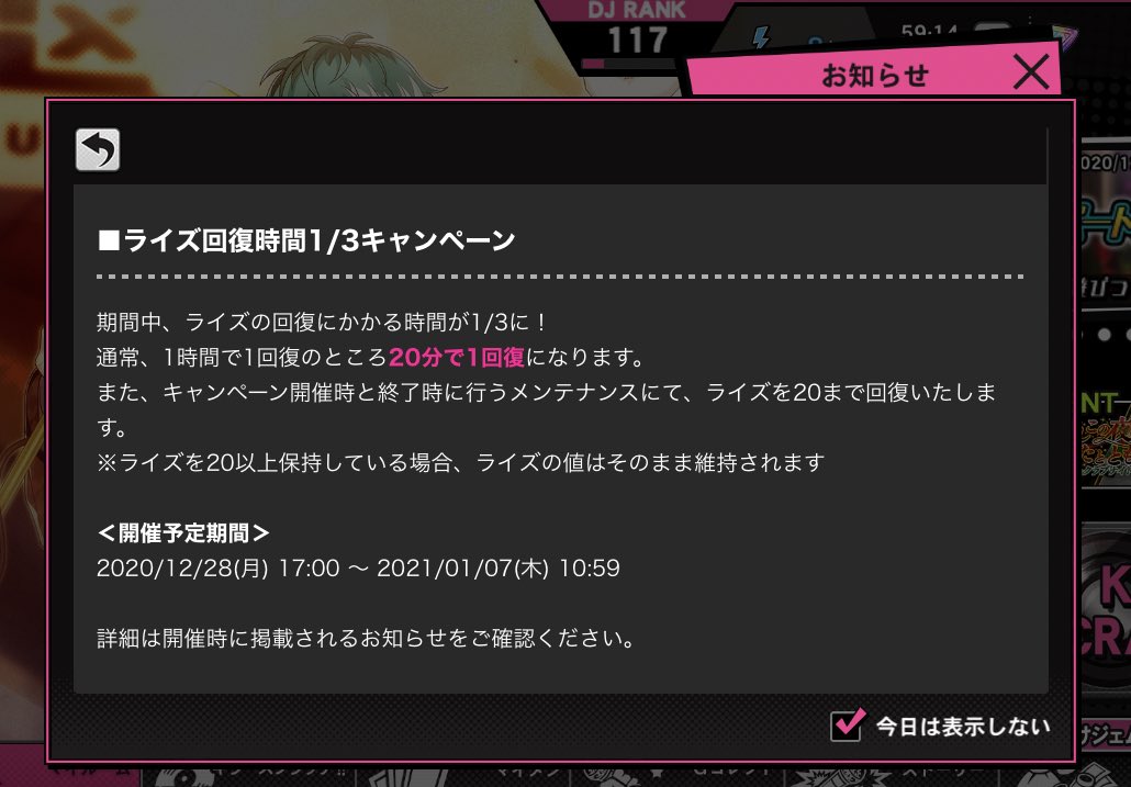 12/28(月) 17:00からはライズ回復時間3/1キャンペーンも