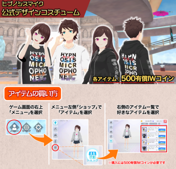「INSPIX WORLD」運営事務局です。10/28(木)より、ヒプマイコラボ企画 ヒプノシスマイク「公式デザインコスチューム」が登場致します!「ヒプノシスマイク OFFICIAL GOODS 販売サイト」にてご確認下さい。にて販売中の「ヒプノシスマイクパーカー」や各ディビジョンデザインのTシャツなどのリアルアイテムが、INSPIX WORLD内コスチュームアイテムとして登場!公式デザインアイテムをINSPIX WORLD内でも身につけて、みんなで楽しもう!特別なファッションアイテムを、ぜひお見逃しなく!【販売期間】10/28(木) メンテナンス終了後〜12/27(月)メンテナンスまで※本アイテムはガチャではなく、欲しいアイテムを指定し、有償コインにてご購入頂けます。