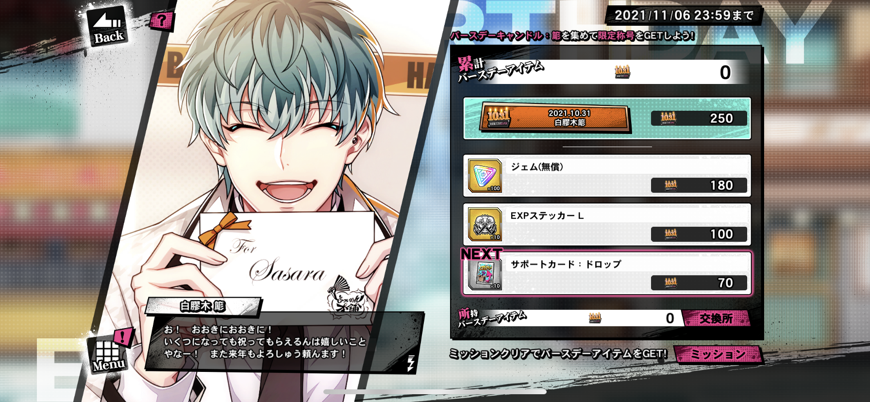 「バースデーキャンドル:簓」の累計数によって報酬が貰える、250個で報酬コンプ