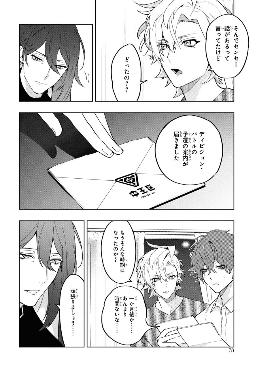 ・原稿と引き換えに乱数を狙うのを止め飴をよこすよう要求する帝統、しかし飴は作れない、飴があっても乱数は壊れる、と話す乙統女、乱数を見逃し帝統と幻太郎も無罪方面、という条件でなんとかまとまる、さらにディビジョンラップバトルへの参加も取り付ける