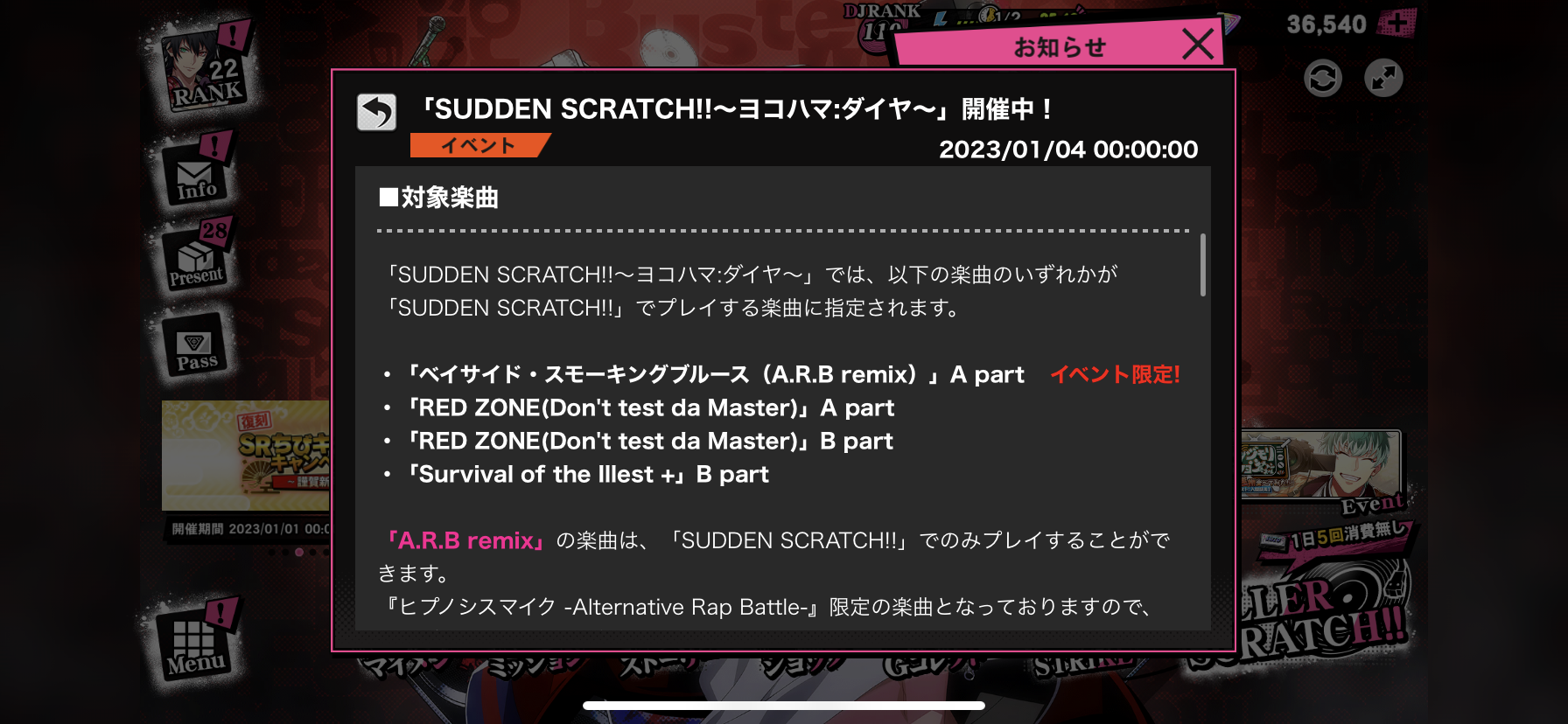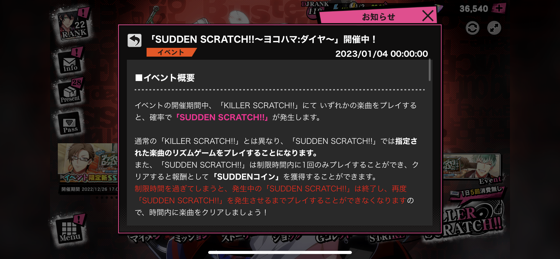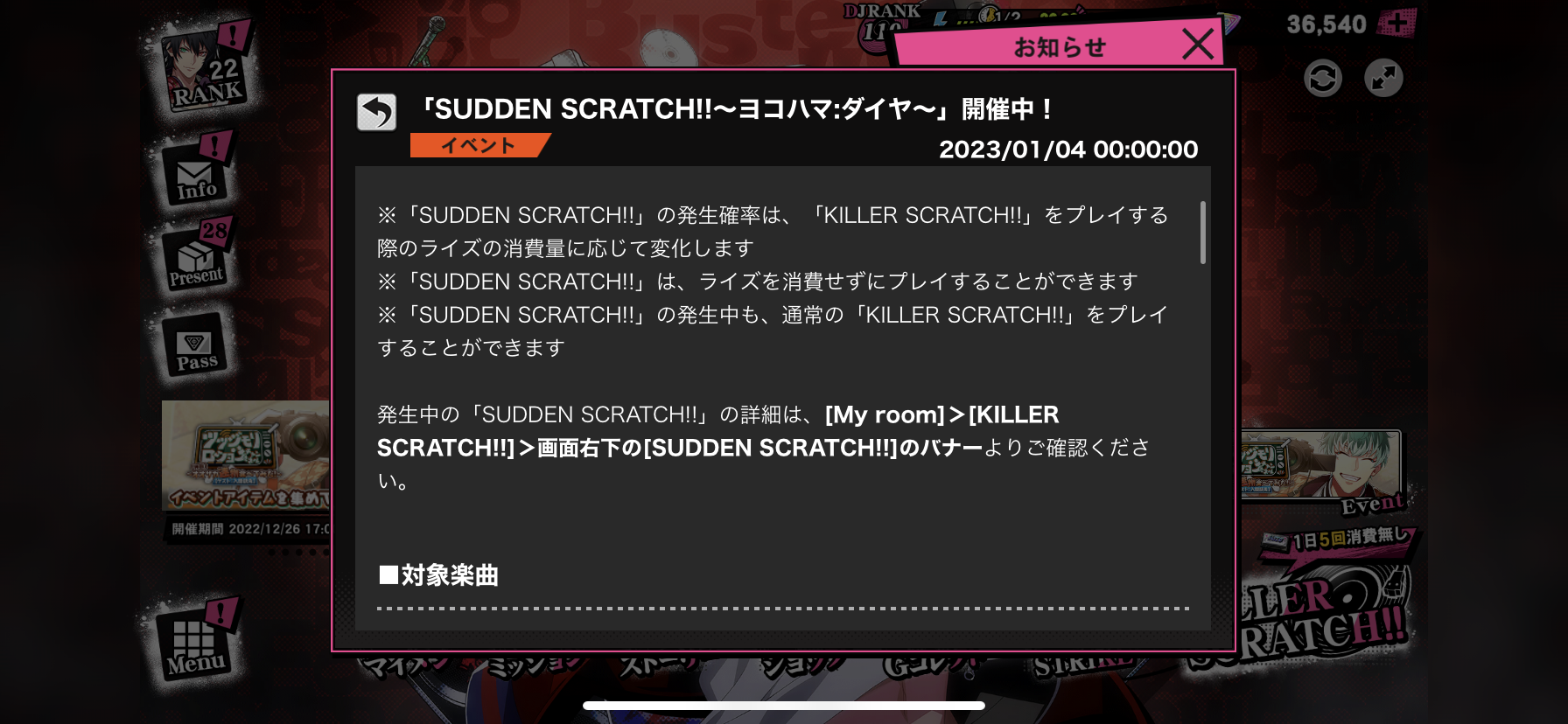 「SUDDEN SCRATCH!!」の曲は指定で制限時間内に1回のみプレイできる、今回のイベントは4パートから選ばれる