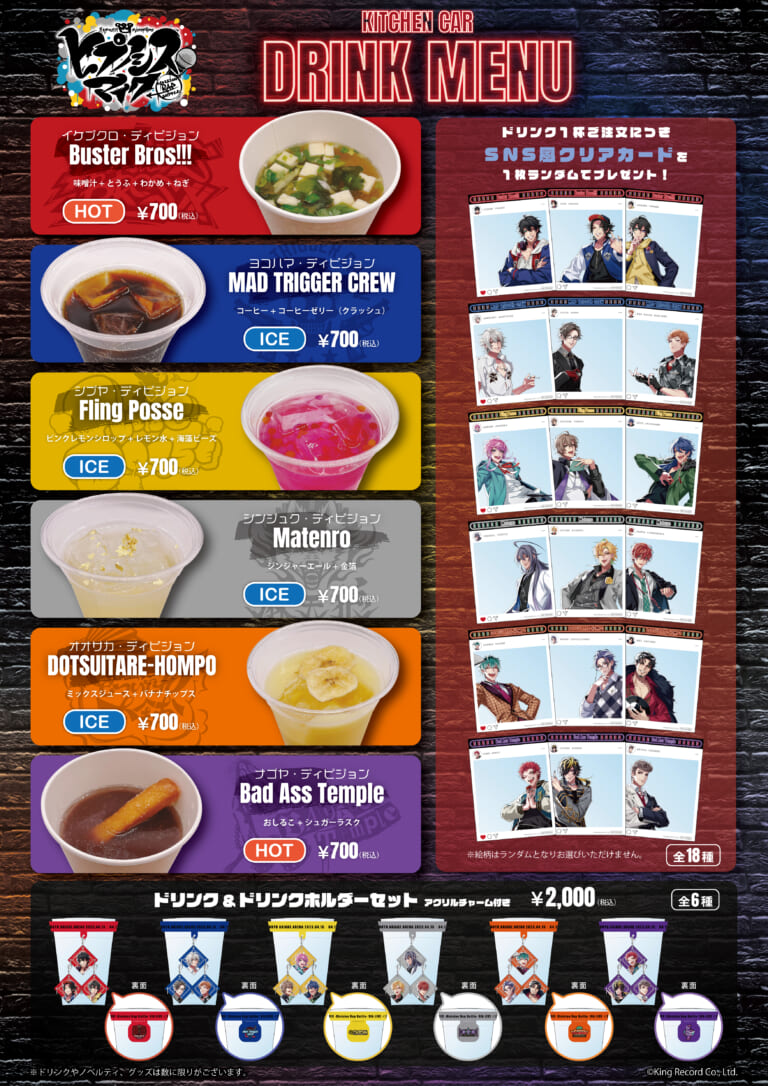 『ヒプノシスマイク -Division Rap Battle- 9th LIVE ≪ZERO OUT≫』にて、コラボキッチンカーの出店が決定!各ディビジョンをイメージしたコラボドリンクやスープを販売いたします!◆開催場所◆有明アリーナ・ドリンク注文レジ:有明アリーナサブアリーナ内・ドリンク引換窓口:駐車場内※ドリンク注文場所と引換場所が離れておりますので、会場内の案内POP等をご確認ください。◆開催時間◆4月15日(土)ドリンク注文レジ:10:00~19:00ドリンク引換窓口:10:00~19:304月16日(日)ドリンク注文レジ:10:00~18:00ドリンク引換窓口:10:00~18:30