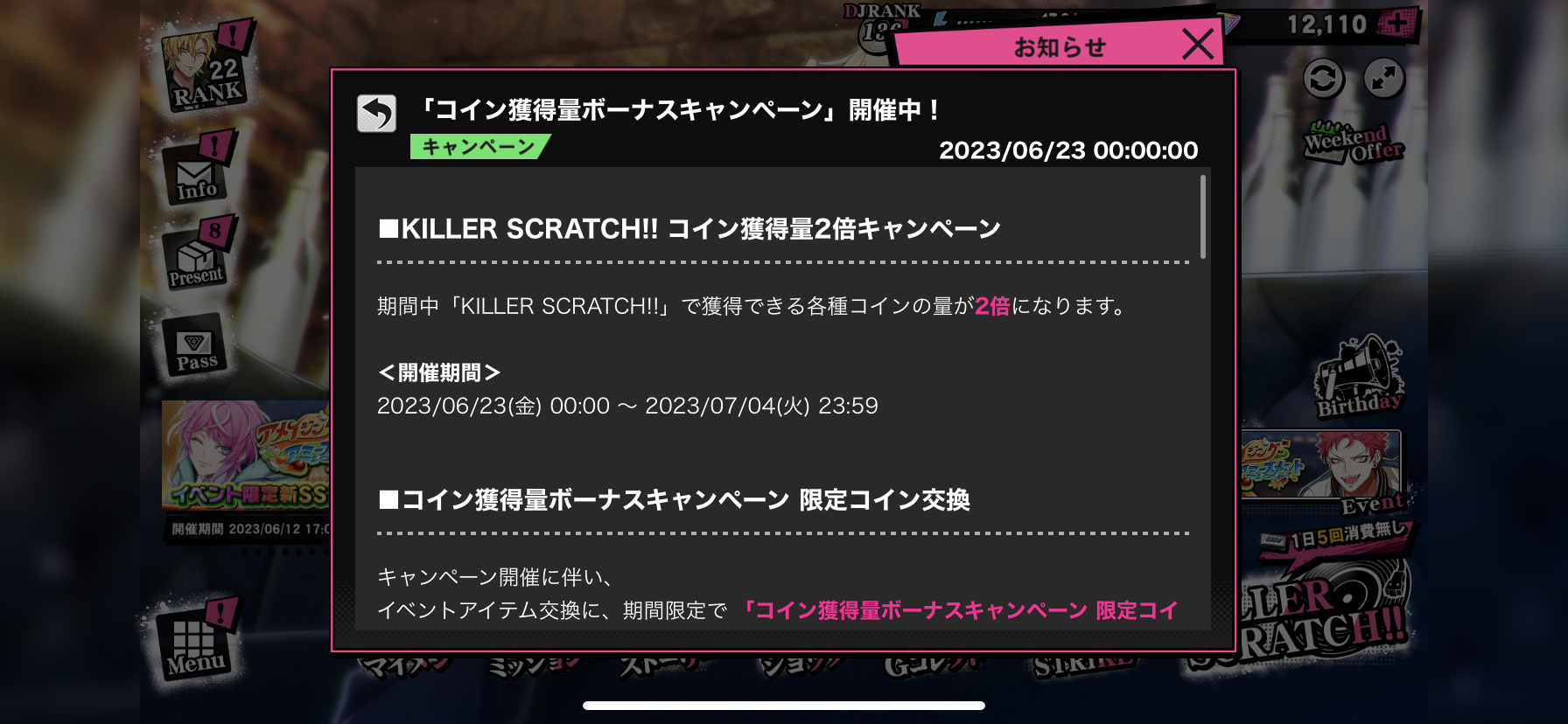 期間中KILLER SCRATCH!!で獲得できる各種コインの量が2倍になる